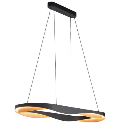 Een bijzondere hanglamp in een modern jasje met een goud detail maakt zichzelf de Ascoli hanglamp ovaal! Ideaal, passend en mooi boven een eettafel met bijvoorbeeld een organische vorm of ovale vorm. De Ascoli hanglamp heeft een lengte van 100 cm, is 36 cm breed en heeft een maximale hoogte van 160 cm. Door zijn golvende vorm die zich samenvormt tot een ovale vorm is afgewerkt in het zwart metaal met een gouden binnenzijde. Hierachter zit een dimbare geïntegreerde LED-module verwerkt van 62 watt LED, in zo'n 2.700 kelvin. De totale lichtopbrengst is maximaal 5580 lumen en is eventueel dimbaar via een externe LED-dimmer. De ovale plafondplaat heeft een afmeting van 40 x 10 x 5 cm met vier zwarte draden waaraan de Ascoli hanglamp ovaal zit bevestigt. Eventueel is de Ascoli hanglamp ook verkrijgbaar in een ronde hanglamp met een doorsnede van 64 cm x max. 160 cm hoog.