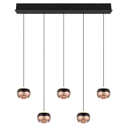 Maak uw keuken of woonkamer compleet met onze stijlvolle én tijdloze hanglamp. Deze Orbit hanglamp 5-lichts zorgt voor een sfeervolle uitstraling in uw interieur. De Orbit hanglamp is voorzien van vijf bollen die afzonderlijk van elkaar in hoogte te verstellen zijn op ieder gewenst moment. Dit komt door zijn lift-me-functie. De vijf bollen hebben een witte kunststof bovenkant, met daar omheen een zwarte metalen rand en daarna een bronskleurige open onderkant. Deze stijlvolle bolletjes zijn voorzien van ieder 8 watt LED en geven ieder 960 lumen aan lichtopbrengst. Dit zorgt voor een hoop licht in uw interieur. Ook is de lichtkleur in te stellen in 2.300, 3.000 of 4.000 Kelvin, via het schuifknopje bovenop de balk (plafondplaat). Deze Orbit hanglamp is ook te dimmen met uw normale wandschakelaar. De Orbit hanglamp 5-lichts heeft een lengte van 100 cm, breedte van 10 cm en een maximale hoogte van 200 cm. Deze Orbit hanglamp geeft uw interieur zowel functionaliteit als stijlvolle verlichting en zorgt voor een tijdloze uitstraling waar u geen genoeg van krijgt!